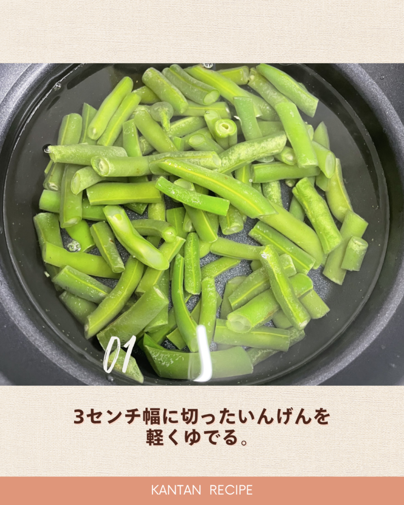 1、いんげんを3センチ幅に切って茹でる