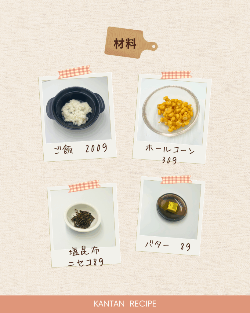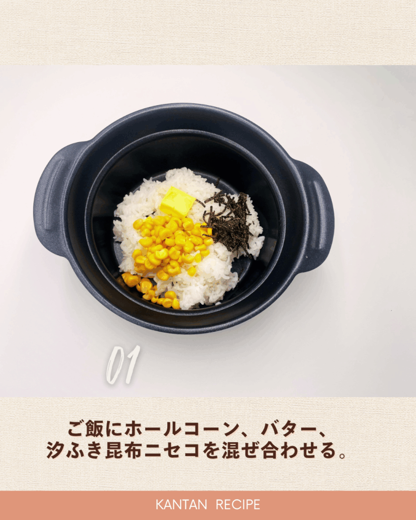 1、ご飯にホールコーン、バター、汐ふき昆布ニセコを混ぜ合わせる。