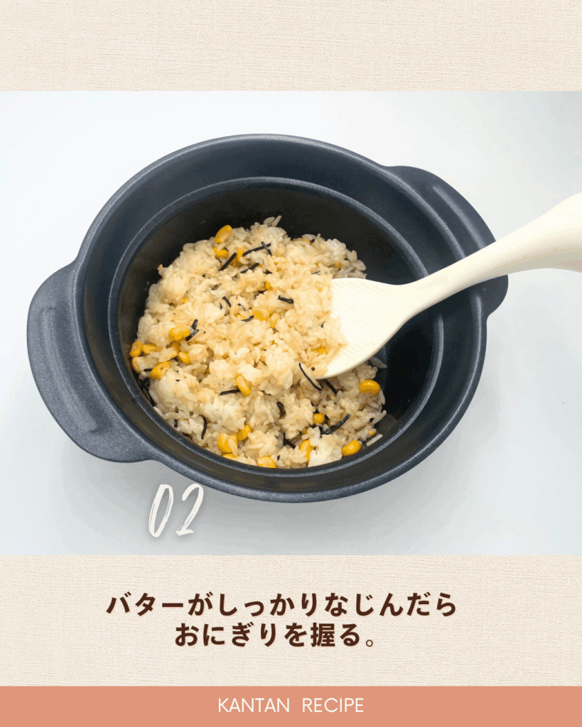 2、バターがしっかりなじんだらおにぎりを握る。