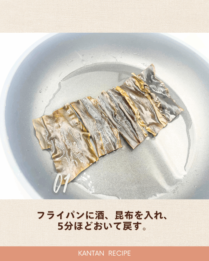 1、フライパンに酒、昆布を入れ、5分ほどおいて戻す。