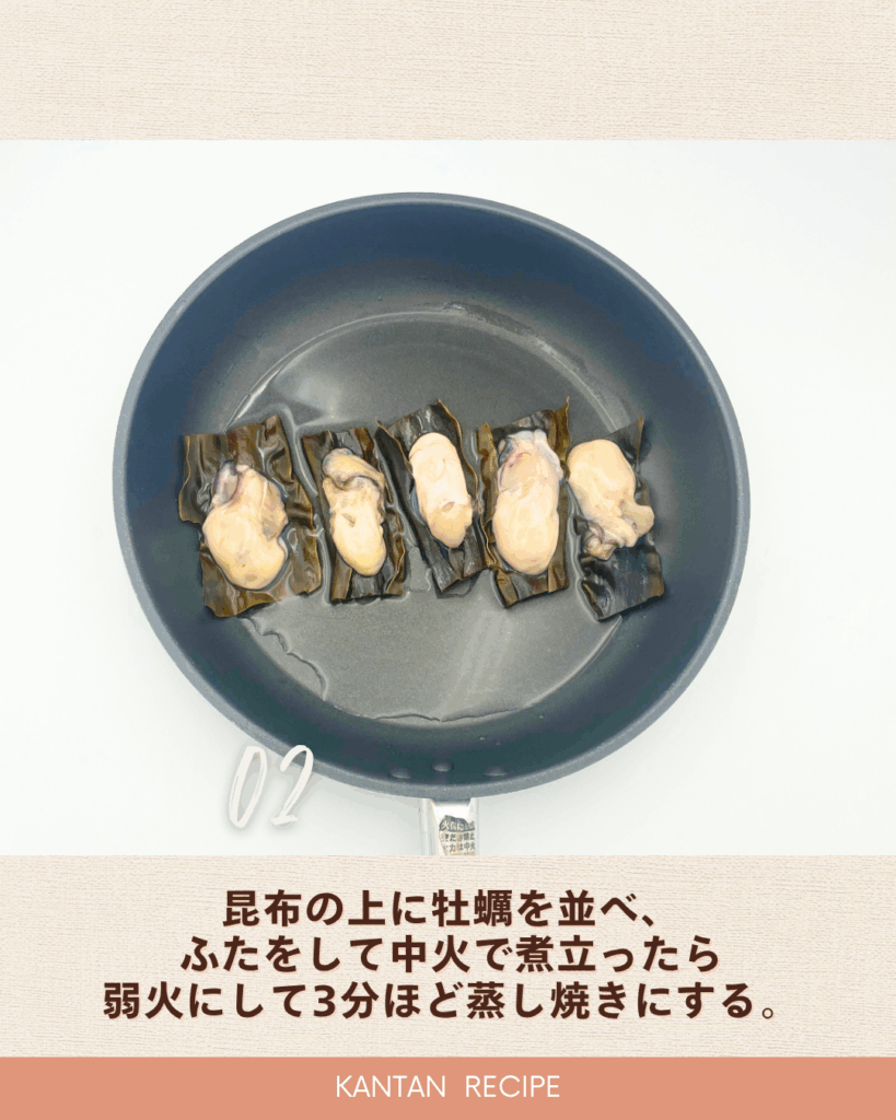 3、昆布に牡蠣を並べ、ふたをして中火で煮立ったら弱火にして3分ほど蒸し焼きにする。